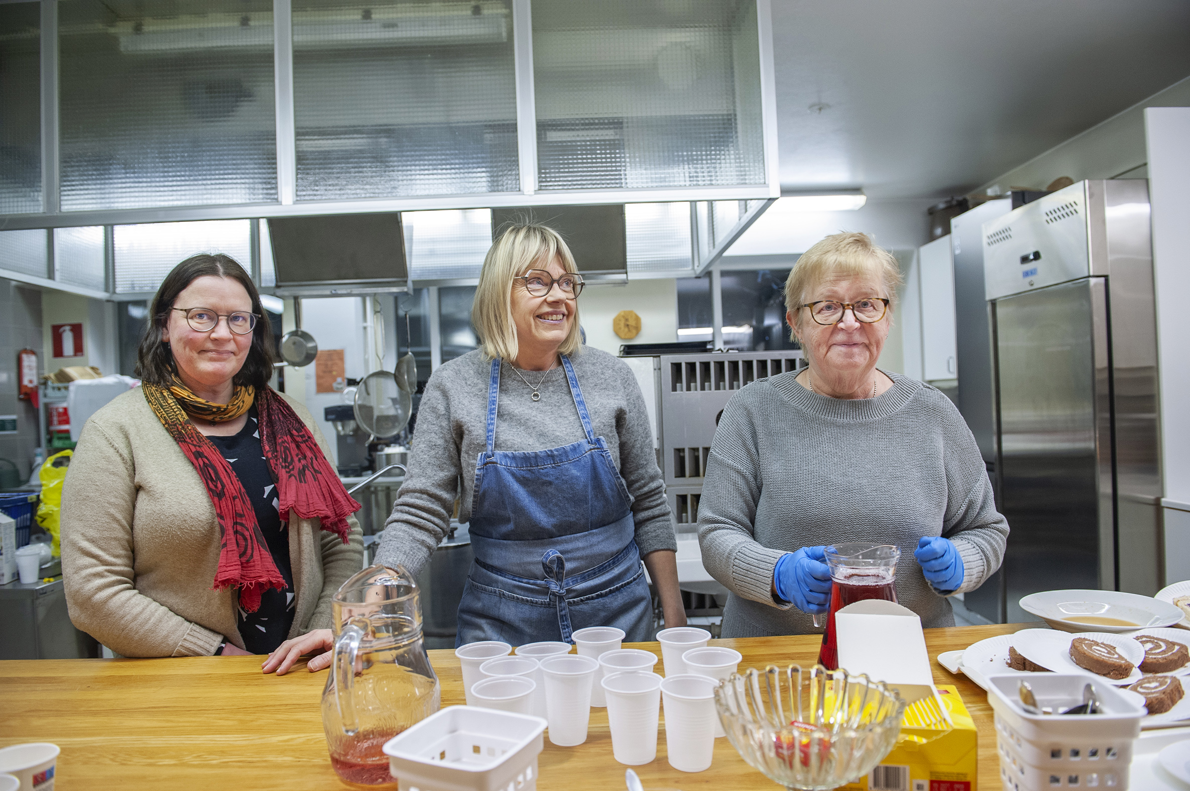 Nanna Sundfors, Malin Karlsson och Maggi Dahlman serverar en strid ström av människor kaffe, saft och rulltårta. För många är gemenskapen kring serveringen lika viktig som själva mathjälpen.