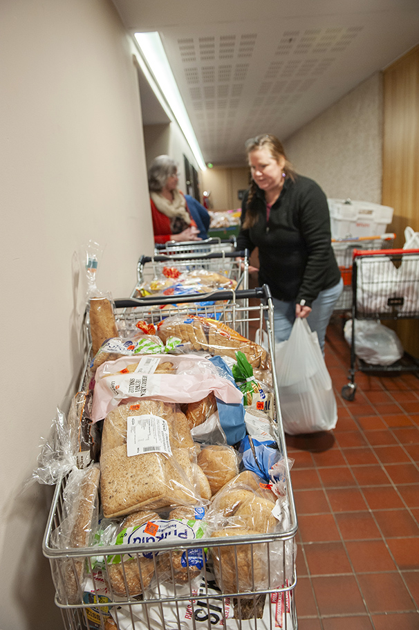 Kundvagnar fulla med bröd står lastade i en korridor. Utrymmena i kyrkans källare är trånga på sina ställen. Det krävs ett tydligt system för att undvika tidsödande flaskhalsar.