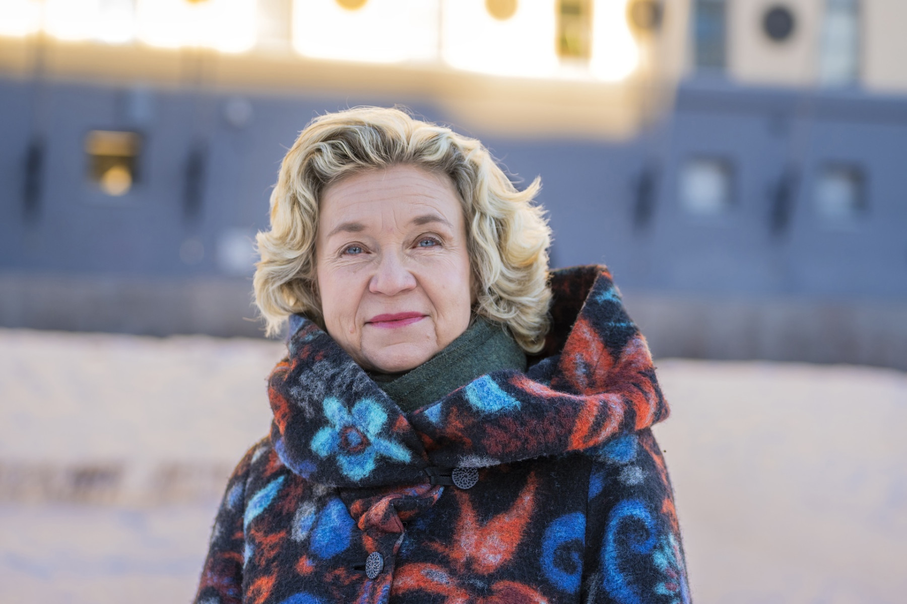 Sirpa Kähkönen sitter på kaféet mittemot Berghälls bibliotek. Nej, hon bor och verkar inte i sina böckers Kuopio, hon har bott här i Helsingfors ända sedan studietiden, i över 40 år.