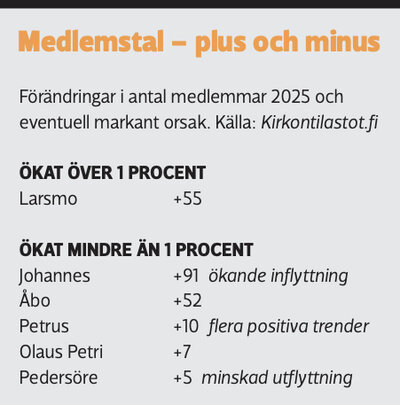 Tre svenska Helsingforsförsamlingar och församlingarna i Larsmo, Pedersöre och Åbo växte i medlemsantal under år 2025. Flera medlemmar nu än i fjol har Johannes, Petrus och Olaus Petri i Helsingfors.